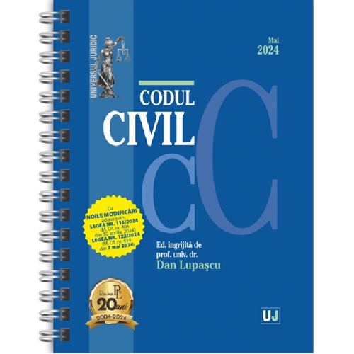 Lucrarea Codul civil Mai 2024 (editie spiralata), ingrijita de prof. univ. dr. Dan Lupascu si tiparita pe hartie alba de calitate superioara, contine, pe langa textul actualizat al Codului civil (cu noile modificari aduse prin Legea nr. 116/2024 – M. Of. nr. 406 din 30 aprilie 2024 si prin Legea nr. 122/2024 – M. Of. nr. 414 din 7 mai 2024), si: dispozitii de aplicare si conexe; extrase din Constitutia Romaniei; decizii CNA; decizii ICCJ (RIL si HP) si CCR.